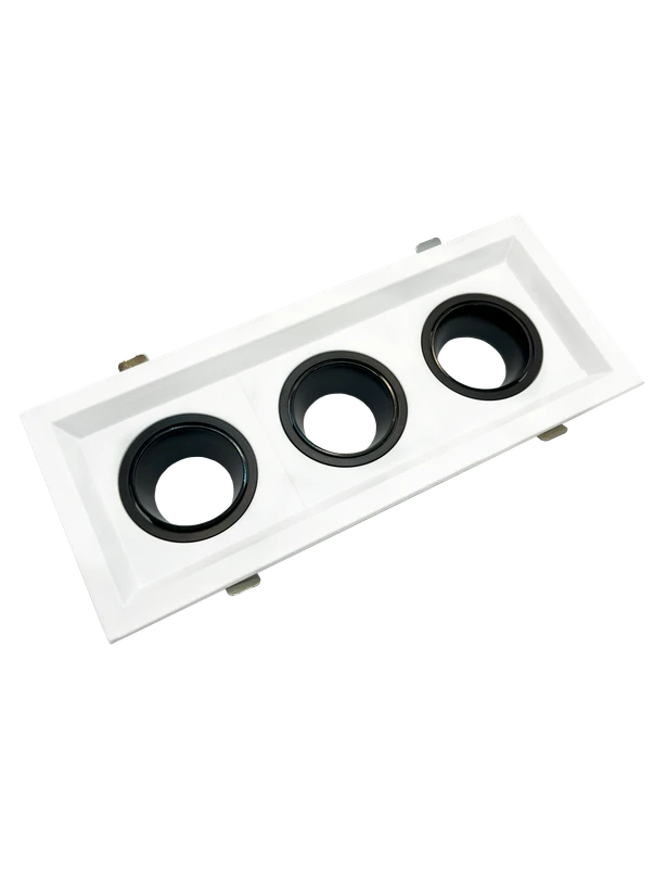 قاب هالوژن مربع سهتایی مشکی–سفید با طراحی مدرن و بدنه آلومینیومی مقاوم، انتخابی ایدهآل برای فضاهایی است که نیاز به نورپردازی یکنواخت و خطی دارند. این مدل دارای سه جایگاه مجزا برای لامپ بوده و امکان تنظیم زاویه تابش هر لامپ را بهصورت مستقل فراهم میکند. ترکیب رنگ سفید بدنه با رینگ داخلی مشکی، جلوهای لوکس و مینیمال به دکوراسیون میبخشد.